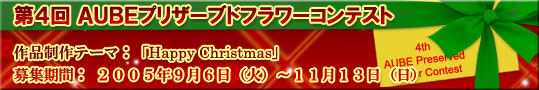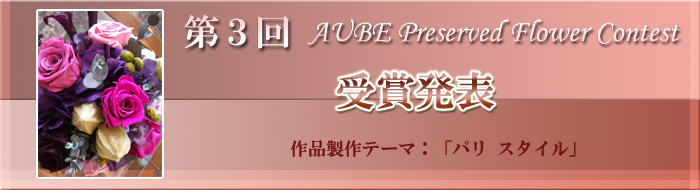 | 2005年8月1日(月)〜9月4日(日)に行われた、第三回AUBEプリザーブドフラワーコンテスト開催から締め切りまでの間、本当に沢山のご応募を頂きました。どの作品もそれぞれとても素晴らしく審査も非常に難航しましたが、厳選なる審査の結果、最優秀賞1点、優秀賞2点が決定致しました。見事、受賞された三名の方々、真におめでとうございます。 |