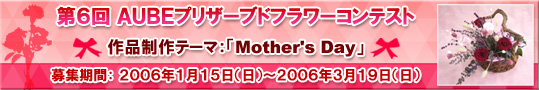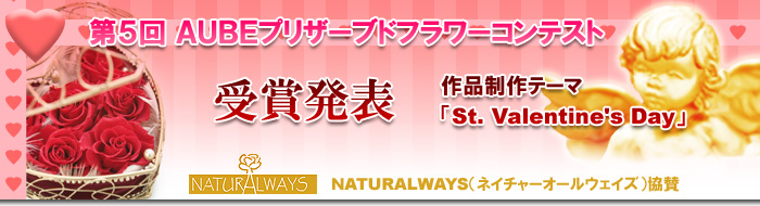 2005年11月20日(日)〜2006年1月8日(日)に行われた、第五回AUBEプリザーブドフラワーコンテスト開催から締め切りまでの間、本当に沢山のご応募を頂きました。どの作品もそれぞれとても素晴らしく審査も非常に難航しましたが、厳選なる審査の結果、最優秀賞1点、優秀賞2点が決定致しました。見事、受賞された三名の方々、真におめでとうございます。