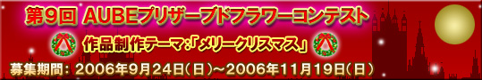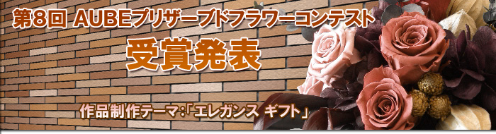 2006年7月2日(日)〜2006年9月10日(日)に行われた、第八回AUBEプリザーブドフラワーコンテスト開催から締め切りまでの間、本当に沢山のご応募を頂きました。どの作品もそれぞれとても素晴らしく審査も非常に難航しましたが、厳選なる審査の結果、最優秀賞1点、優秀賞2点が決定致しました。見事、受賞された三名の方々、真におめでとうございます。