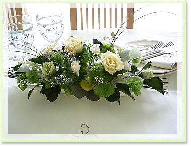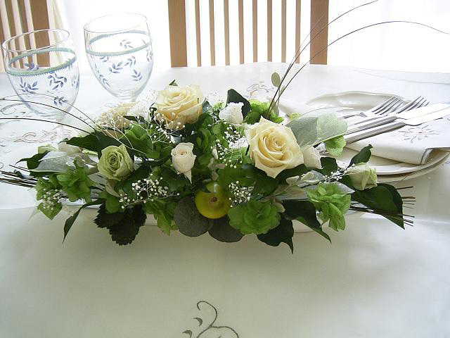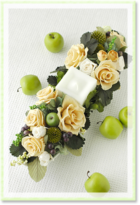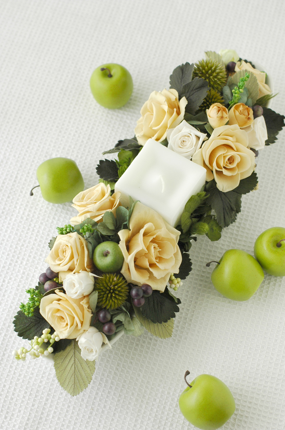 テーブルアレンジということで清潔感もあり、午後のティータイムを想像させるような素敵な作品になっています。