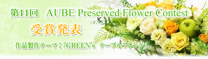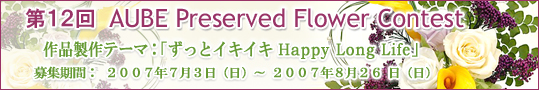 2007年4月8日(日)〜2007年6月10日(日)に行われた、第11回AUBEプリザーブドフラワーコンテスト開催から締め切りまでの間、本当に沢山のご応募を頂きました。どの作品もそれぞれとても素晴らしく審査も非常に難航しましたが、厳選なる審査の結果、最優秀賞1点、優秀賞2点が決定致しました。見事、受賞された3名の方々、真におめでとうございます。