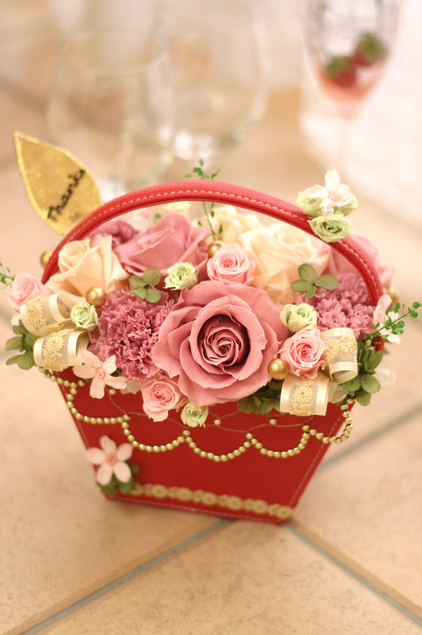 たくさんの「ありがとう」をお花のバックに詰め込んだイメージで製作しました。大小の花材を
