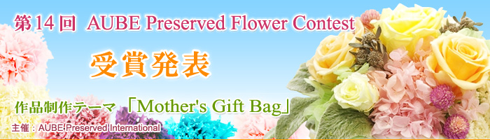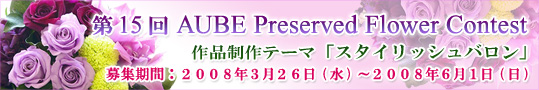 2007年12月16日(日)〜2008年3月2日(日)に行われた、第14回AUBEプリザーブドフラワーコンテスト開催から締め切りまでの間、本当に沢山のご応募を頂きました。どの作品もそれぞれとても素晴らしく審査も非常に難航しましたが、厳選なる審査の結果、最優秀賞1点、優秀賞2点が決定致しました。見事、受賞された3名の方々、真におめでとうございます。