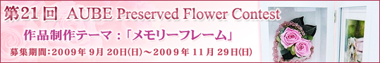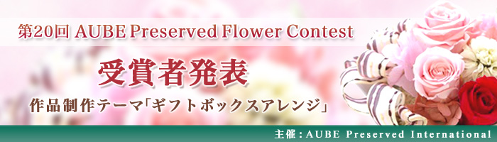 2009年6月21日(日)〜2009年9月6日(日)に行われた、第20回AUBEプリザーブドフラワーコンテスト開催から締め切りまでの間、本当に沢山のご応募を頂きました。どの作品もそれぞれとても素晴らしく審査も非常に難航しましたが、厳選なる審査の結果、最優秀賞1点、優秀賞2点が決定致しました。見事、受賞された3名の方々、真におめでとうございます。