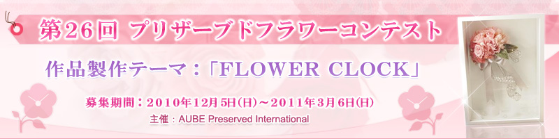 対象花材(VERMONT プチダリア各色)と対象花器(ウッドフレームクロックL)を使い、プリザーブドフラワーをメインにしたギフトとして最適な作品。また、お手持ちの花材、資材等は、ご自由にお使い下さい。一人何作品でも奮って応募して下さい。