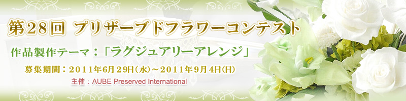 対象花材(FLOREVER プレミアムリリーまたは南原農園 カサブランカ、KARIN ROSE ユリ、南原農園 胡蝶蘭、ユーチャリスどちらか)と対象資材(資材コーナーにて販売の商品)と対象花器(花器コーナーにて販売の商品)を使い、プリザーブドフラワーをメインにしたギフトとして最適な作品。また、お手持ちの花材、資材等は、ご自由にお使い下さい。一人何作品でも奮って応募して下さい。
