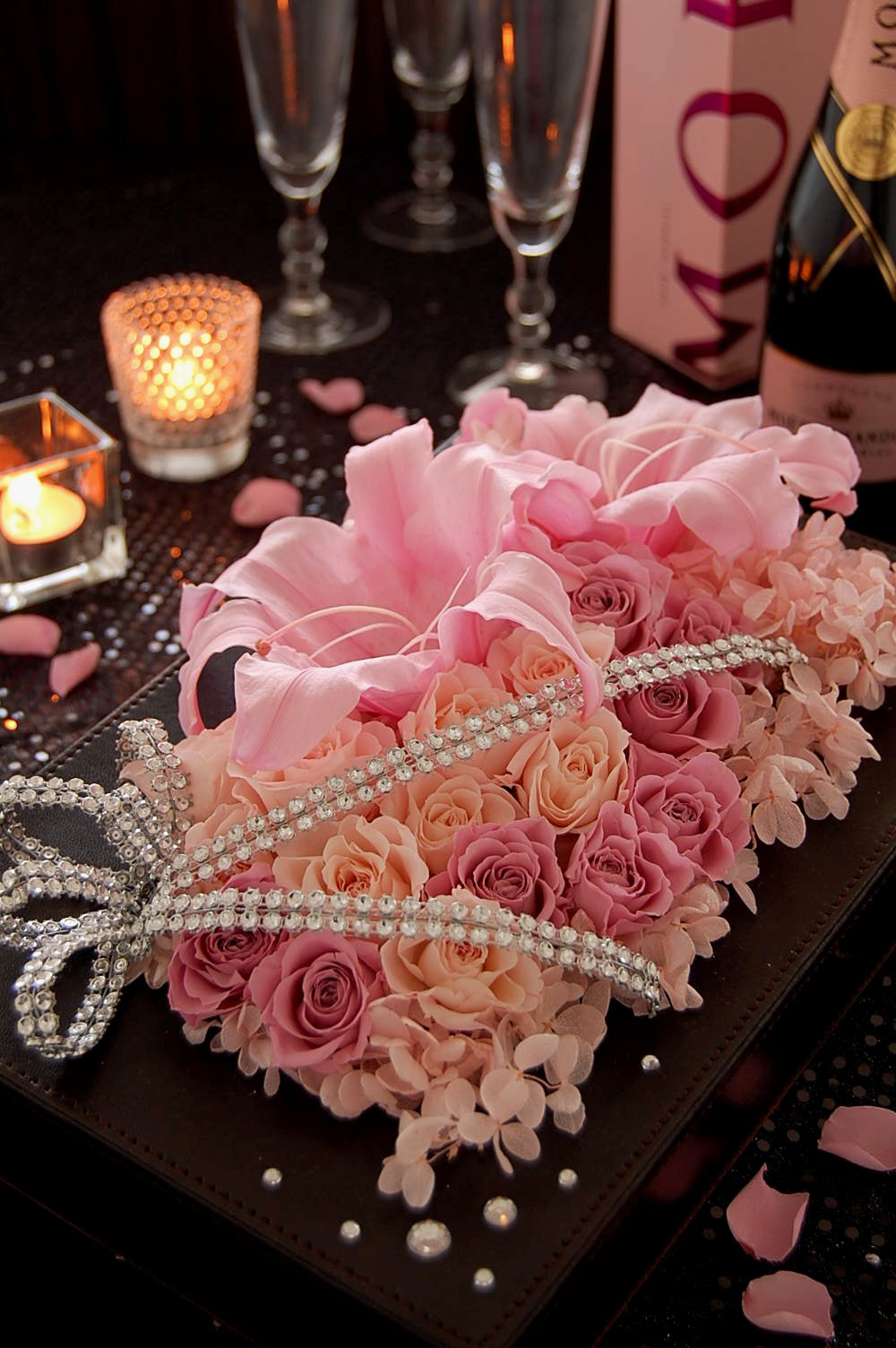 特別な日の贈り物に。ピンクのユリ、たっぷ りのバラを敷き詰めて豪華で温かい雰囲気に仕上げました。