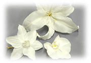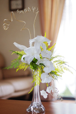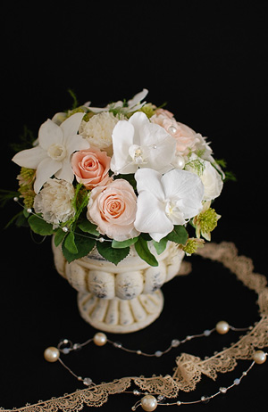 それぞれの素材を引き立て合う組み合わせ、デザインとなっています。可愛らしさの中に上品なゴージャス感が有ります。百合の印象的なデザインを上品にまとめています。