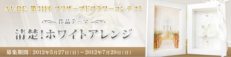 対象花材 ホワイトのプリザーブドフラワー(メーカーは問わず)と対象資材(資材コーナーにて販売の資材)と対象花器(花器コーナーにて販売の商品)を使い、プリザーブドフラワーをメインにしたギフトとして最適な作品。また、お手持ちの花材、資材等は、ご自由にお使い下さい。一人何作品でも奮って応募して下さい。