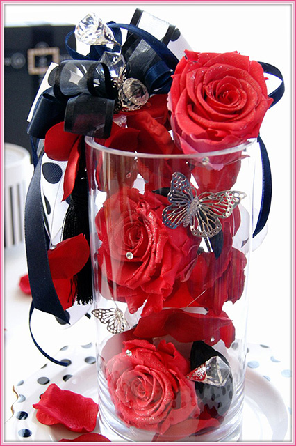 数種類のリボンやクリスタル、蝶などの資材がプリザーブドフラワーのキラキラのレッドのローズと