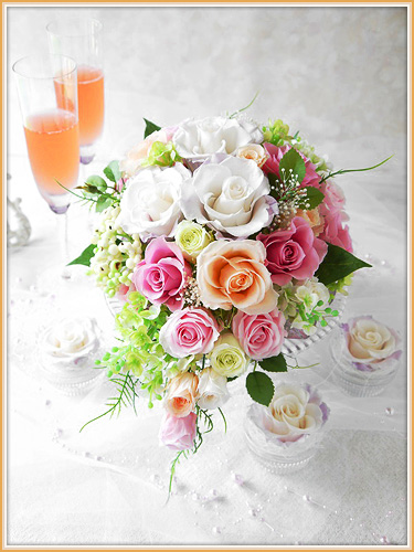 咲き方の違うローズをたくさん使用し、副素材やグリーンが