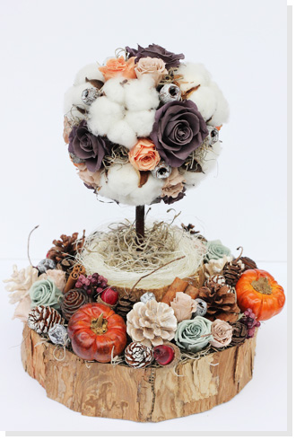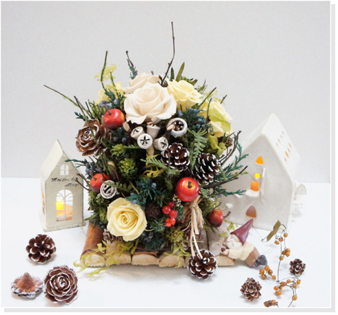 今回のテーマ「〜Forest〜」にピッタリでまるで絵本の世界のような物語を感じるオリジナリティーあふれるデザインです。プリザーブドフラワーのローズと数種類のグリーンと木の実などの多くの素材を使用していながら調和していて白樺ベースも上手に使われています。