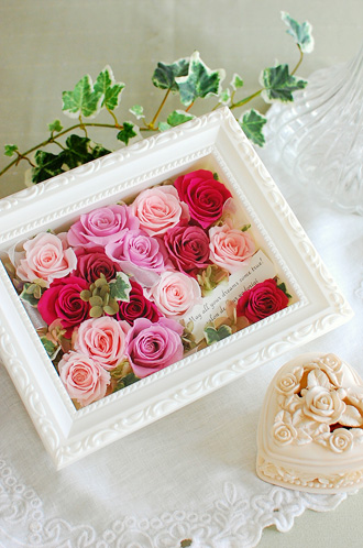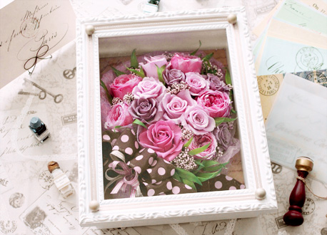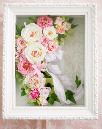 幸せの思い出が、ぎゅっと詰まったブーケをエレガントな真っ白いフレームに閉じ込めました。真ん中がほんのりピンク色の薔薇を中心に優しくて可憐な表情のお花達が、春のメロディーを奏でるように、華やかに咲き誇っています。