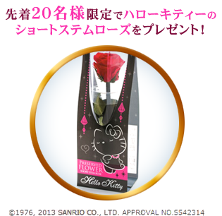 フロールエバーの新商品ハローキティのラグジュアリー柄パッケージ。 ショートステムローズを応募者先着限定20名様にプレゼント♪ コンテスト期間中に対象商品を購入、応募規定条件を満たし、不備なくご応募された応募者にプレゼント(お一人様1点となります) ※参加賞のプレゼントをお送りする際にはご応募の条件や合い言葉が必要となりますのでご応募の際には参加賞特典のお受け取り方法についてお問い合わせ下さいませ。 |