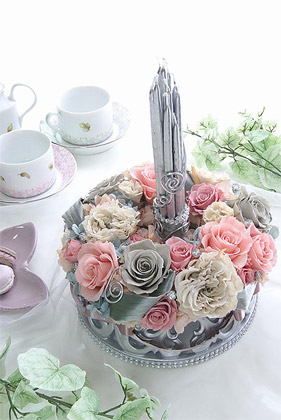 プリザーブドフラワーをメインに(指定花材の大地農園のローズ又は、アモローサのローズの使用は必須)その他、プリザーブドフラワー、グリーン、アーティフィシャルフラワーや資材、リボンを自由に使い40回コンテスト指定花器を使用したお茶を楽しむひと時を素敵に演出するテーブルアレンジ作品。