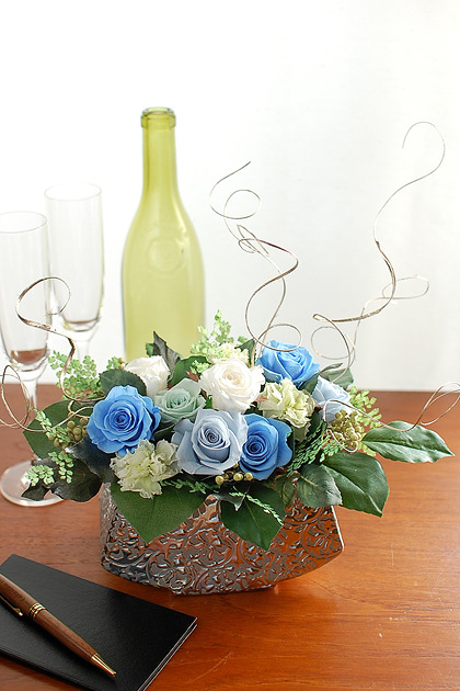 対象花材(花材コーナーにて販売のプリザーブドフラワー)と対象花器(花材コーナーにて販売の花器)、対象資材(資材、アーティフィシャルフラワー、木の実・ナチュラル素材、リボンコーナーのいずれかに掲載されている商品)を使い、プリザーブドフラワーをメインにしたギフトとしても最適な作品。