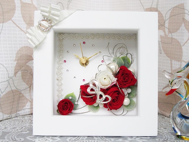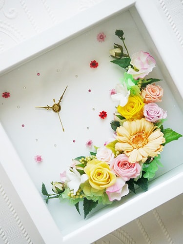 対象花材(花材コーナーにて販売のプリザーブドフラワー)と対象花器(花材コーナーにて販売の時計花器)、対象資材(資材、アーティフィシャルフラワー、木の実・ナチュラル素材、リボンコーナーのいずれかに掲載されている商品)を使い、プリザーブドフラワーをメインにしたギフトとしても最適な作品。