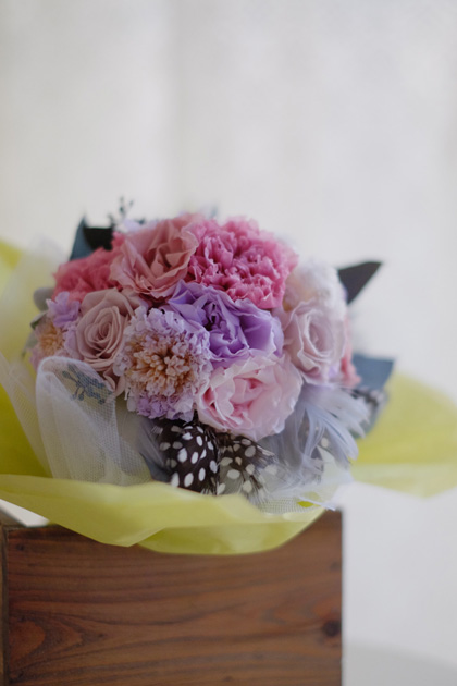 大人っぽいピンク系とホワイト系で上品で温かみのある色と上質な花資材にこだわり、幸せが降り注ぐようイメージしながら仕上げました。手元で華やぐミニブーケとしてもインテリアとしても、優しい時を感じて頂けますように。