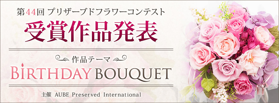 2016年8月23日(火)〜2016年11月27日(日)に行われた第44回AUBEプリザーブドフラワーコンテスト開催から締め切りまでの間、本当に沢山のご応募を頂きました。どの作品もそれぞれとても素晴らしく審査も非常に難航しましたが、厳選なる審査の結果、最優秀賞1点、優秀賞2点が決定致しました。見事、受賞された3名の方々、誠におめでとうございます。