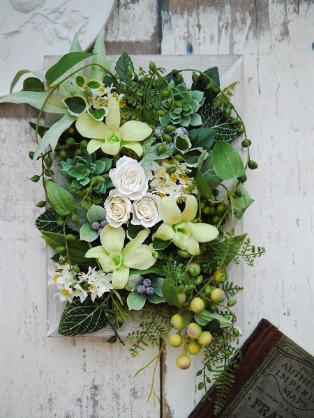 一枚一枚厳選した数種類のプリザーブドのリーフとアジサイを使ったグリーンリースをアンティークフレームにセットしました。 季節を問わず飾っていただけるフレームは新築祝等のギフトにもおすすめです。 インテリアをワンランクアップしてくれるグリーンアレンジを楽しんでいただけたら嬉しいです。