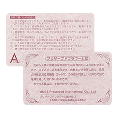 全ての商品に、美しさを宿し続けるプリザーブドフラワーの説明、取扱方法を記載したカードが無料で付きます。