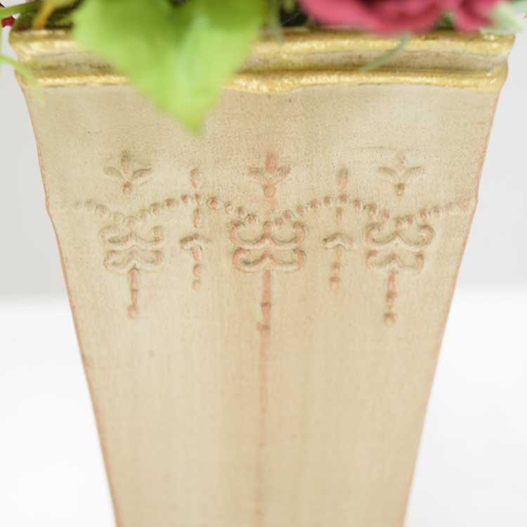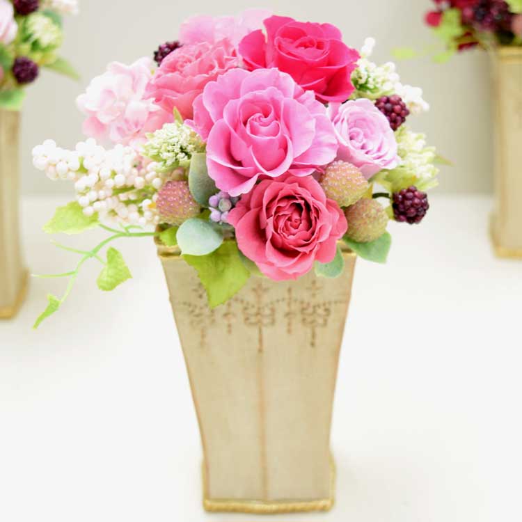 アンティーク調の陶器に、ミニバラの綺麗な色のグラデーションが可愛い作品です。
