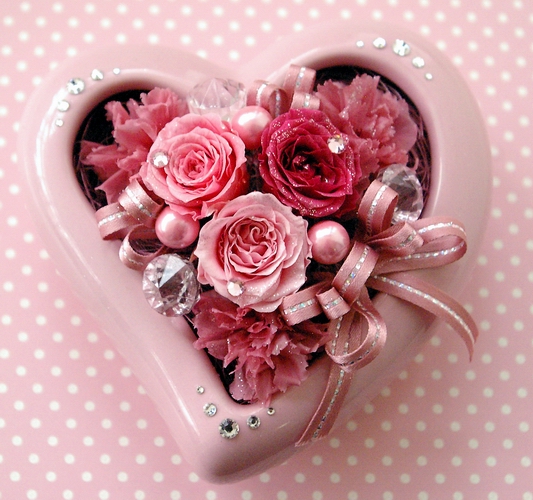 スワロフスキーの輝きがとっても綺麗なミニハートフレームアレンジ♪あなたの気持ちをそのまま形にしたようなピンクのハート型の器に全体をピンクでまとめたラブリーなアレンジは普段口には出せない想いも届けてくれそう♪ローズやカーネーションにはキラキラのラメが付いていてそのままでも綺麗なのにさらにスワロフスキーが付いてキラキラ感アップ☆花器の縁取りにもスワロフスキーを使用していて全体がキラキラと光輝く素敵なアレンジです。スタンドが付いているので立てて飾ることも出来、お手持ちのリボンや紐を背面の穴に通して頂ければ壁掛けにもなっちゃう優れもの!「置き型」「スタンド型」「壁掛け」と3通りの飾り方が出来るので飾る場所にも困りません☆こんな素敵なアレンジで気持ちも一緒にプレゼントしてみて下さい♪